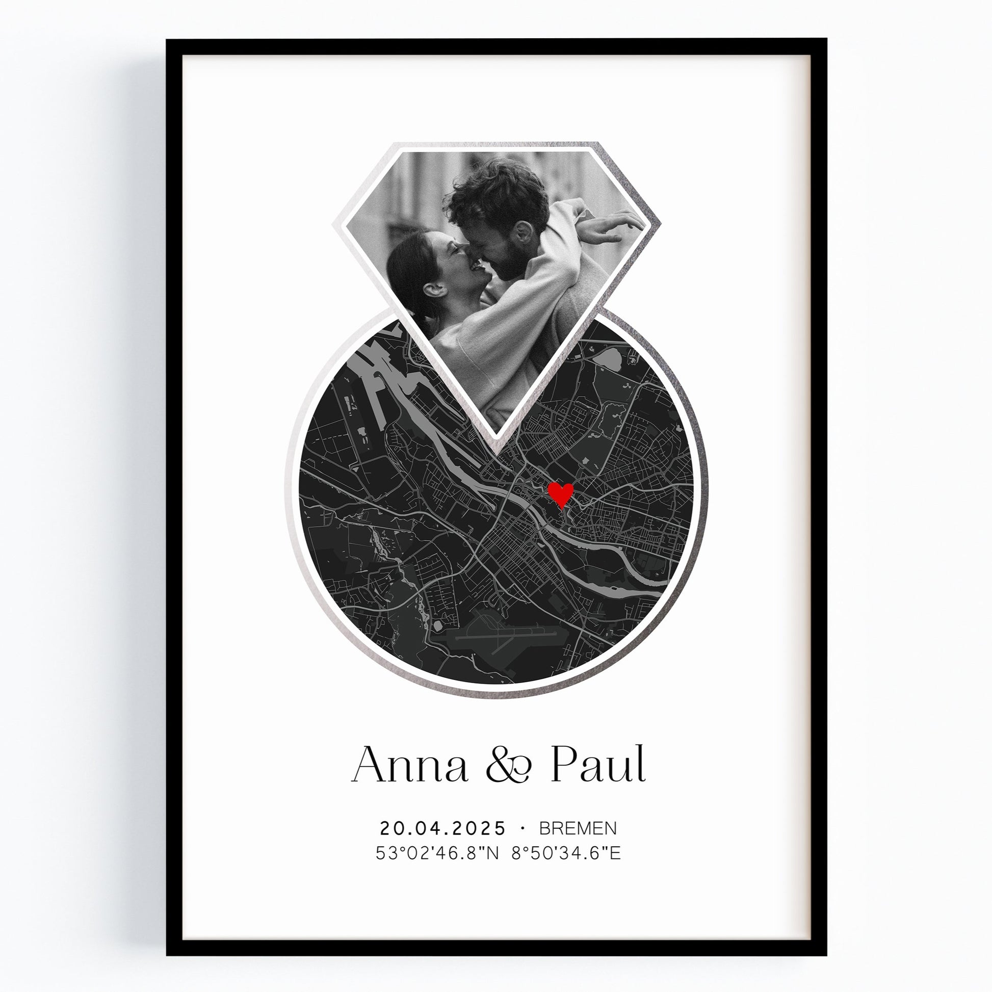 Personalisierter Poster in Ringform – mit Stadtkarte als Ring und Foto des Paares als funkelnder „Stein“. Ein einzigartiges Koordinaten-Bild für Verlobung, Hochzeitstag oder Silberhochzeit 💍