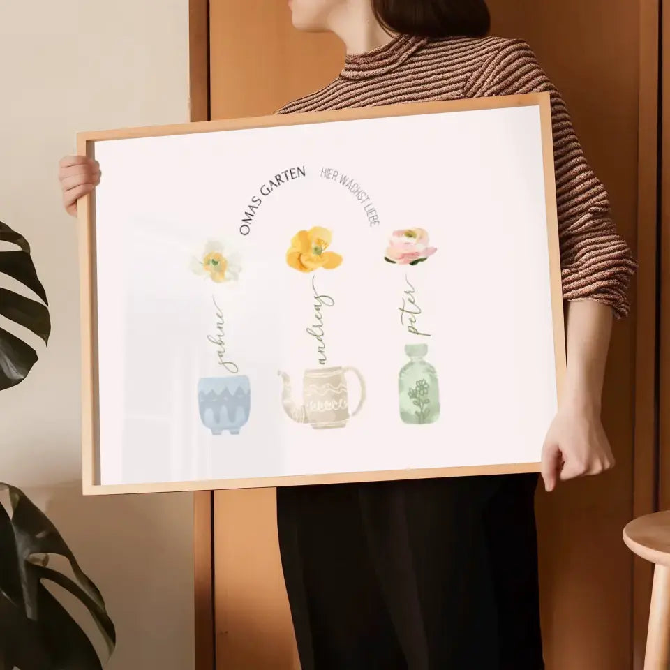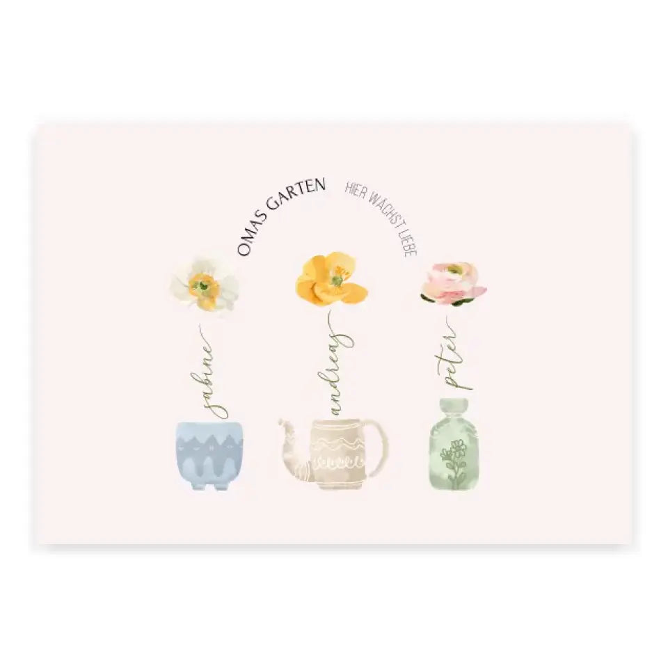 🎁 Dieses individuelle Poster ist mit dem Text "Omas Garten" gestaltet und verziert mit den Namen ihrer Enkelkinder. Es ist eine herzliche Erinnerung an die bedingungslose Liebe, die Oma ihren Enkeln entgegenbringt.