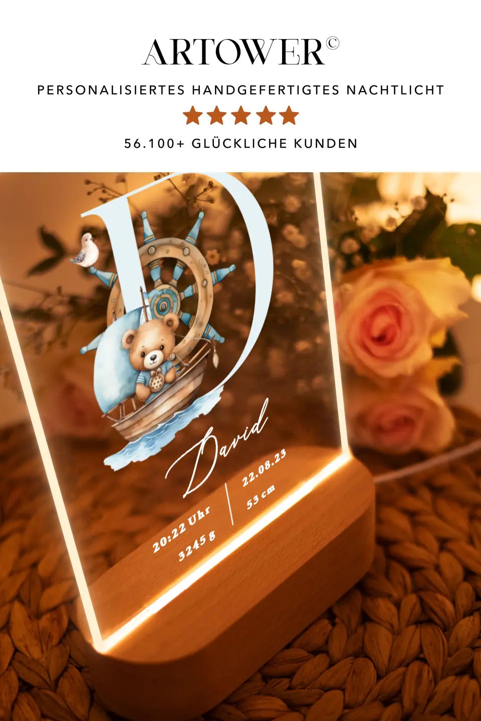 Unsere Acryl Nachtlampe mit niedlichem Tiermotiv und persönlich gedruckten Daten ist das ideale Geschenk zur Geburt.