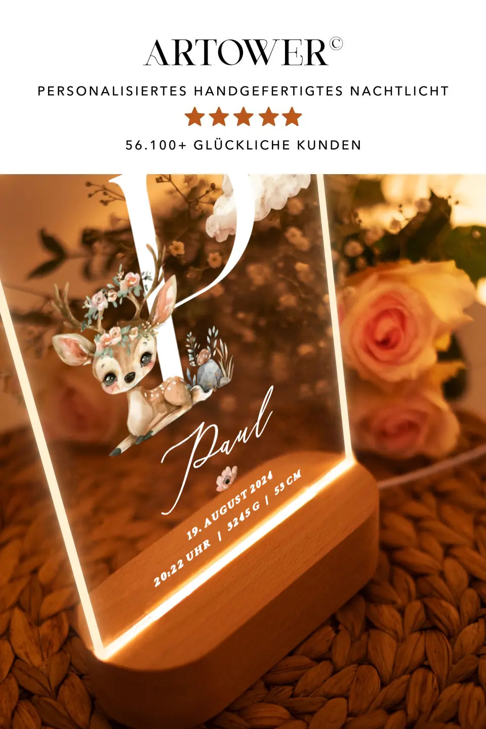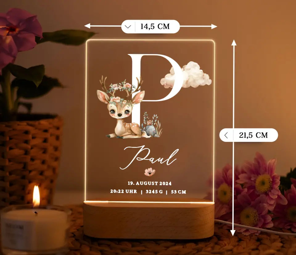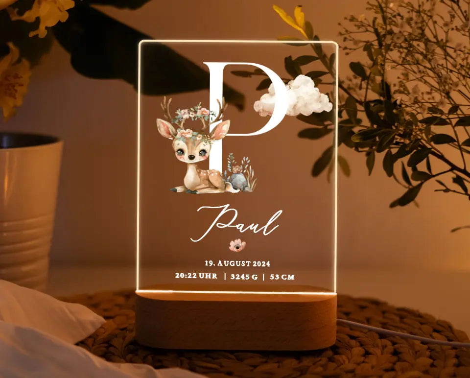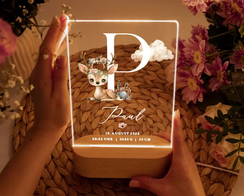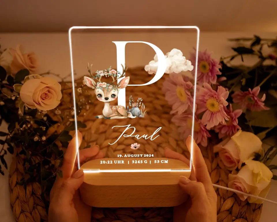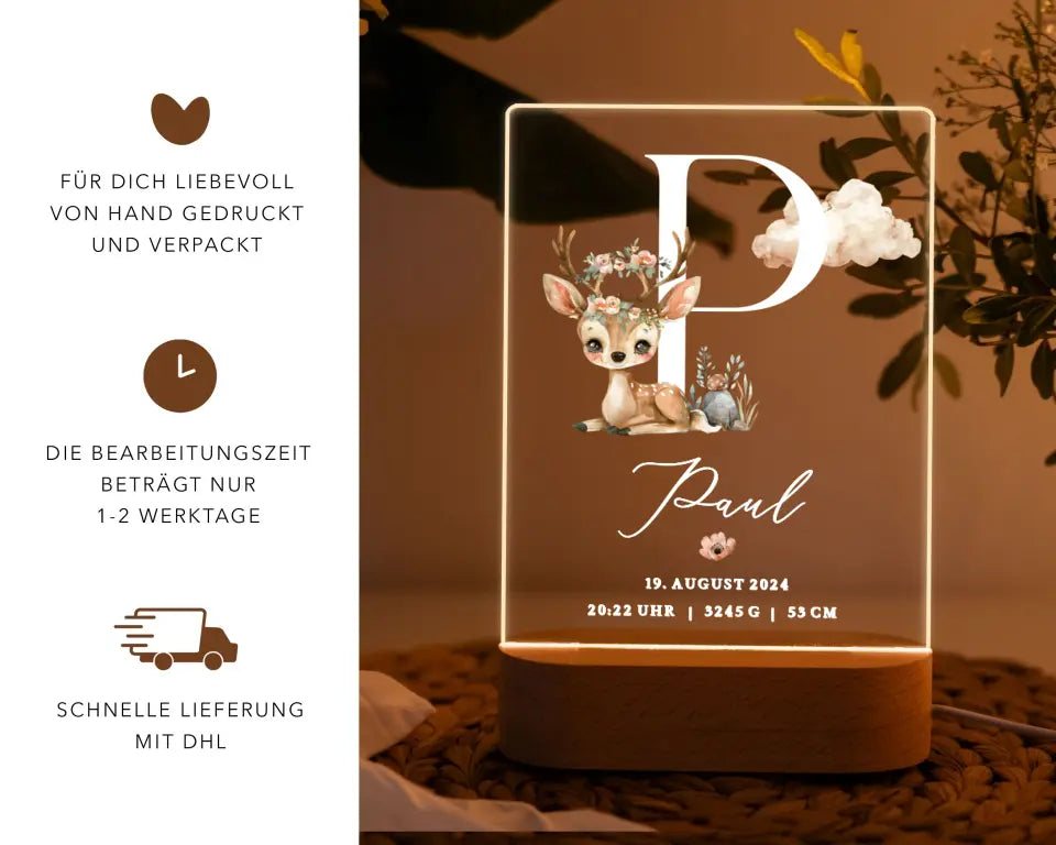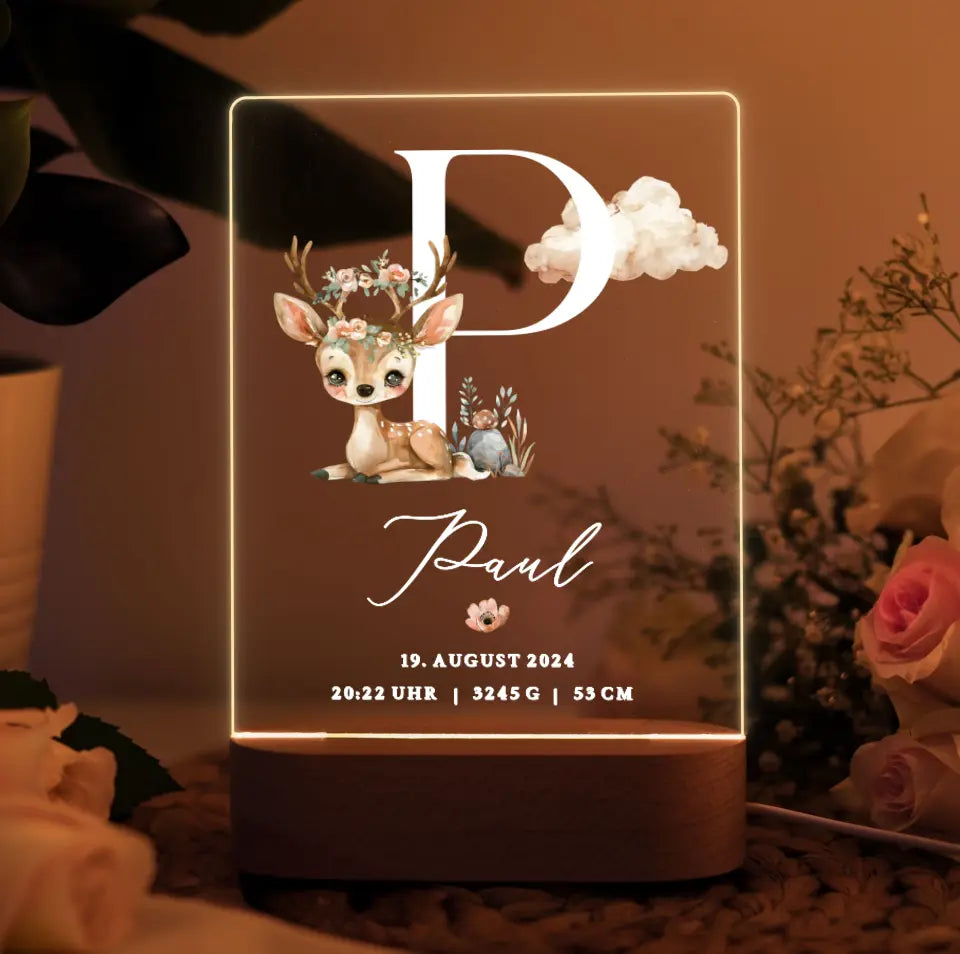 Unsere Nachtlampe mit Tiermotiv und gedruckten Geburtsdaten ist das perfekte personalisierte Geschenk zur Geburt.