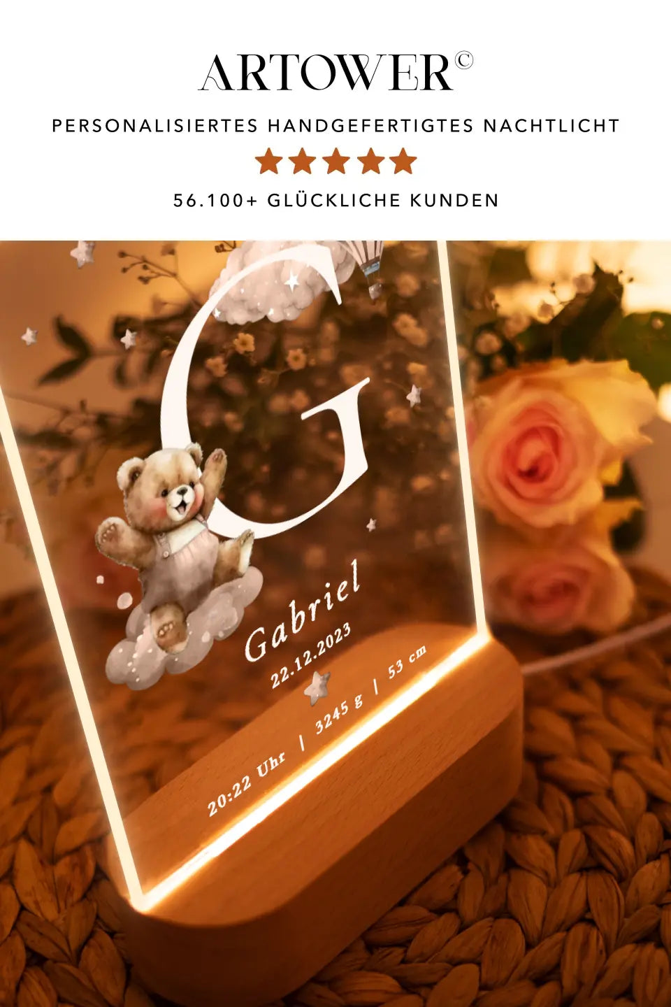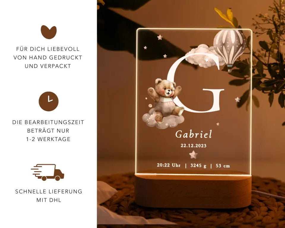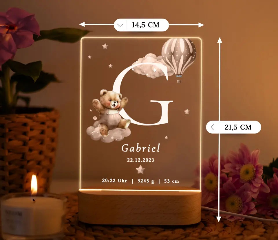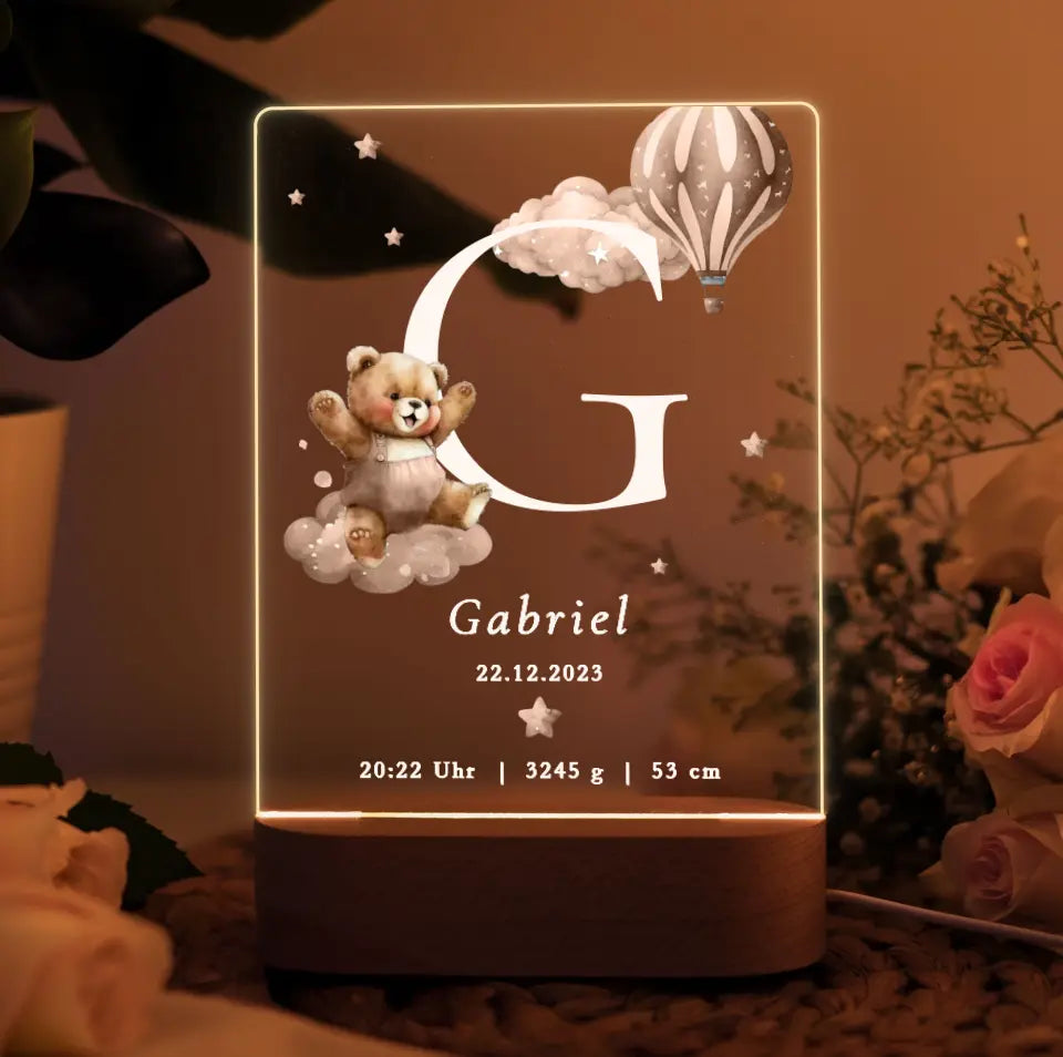Unsere Nachtlampe mit Tiermotiv ist das perfekte personalisierte Geschenk zur Geburt. Mit gedruckten Namen und Geburtsdaten bringt sie Freude ins Kinderzimmer.