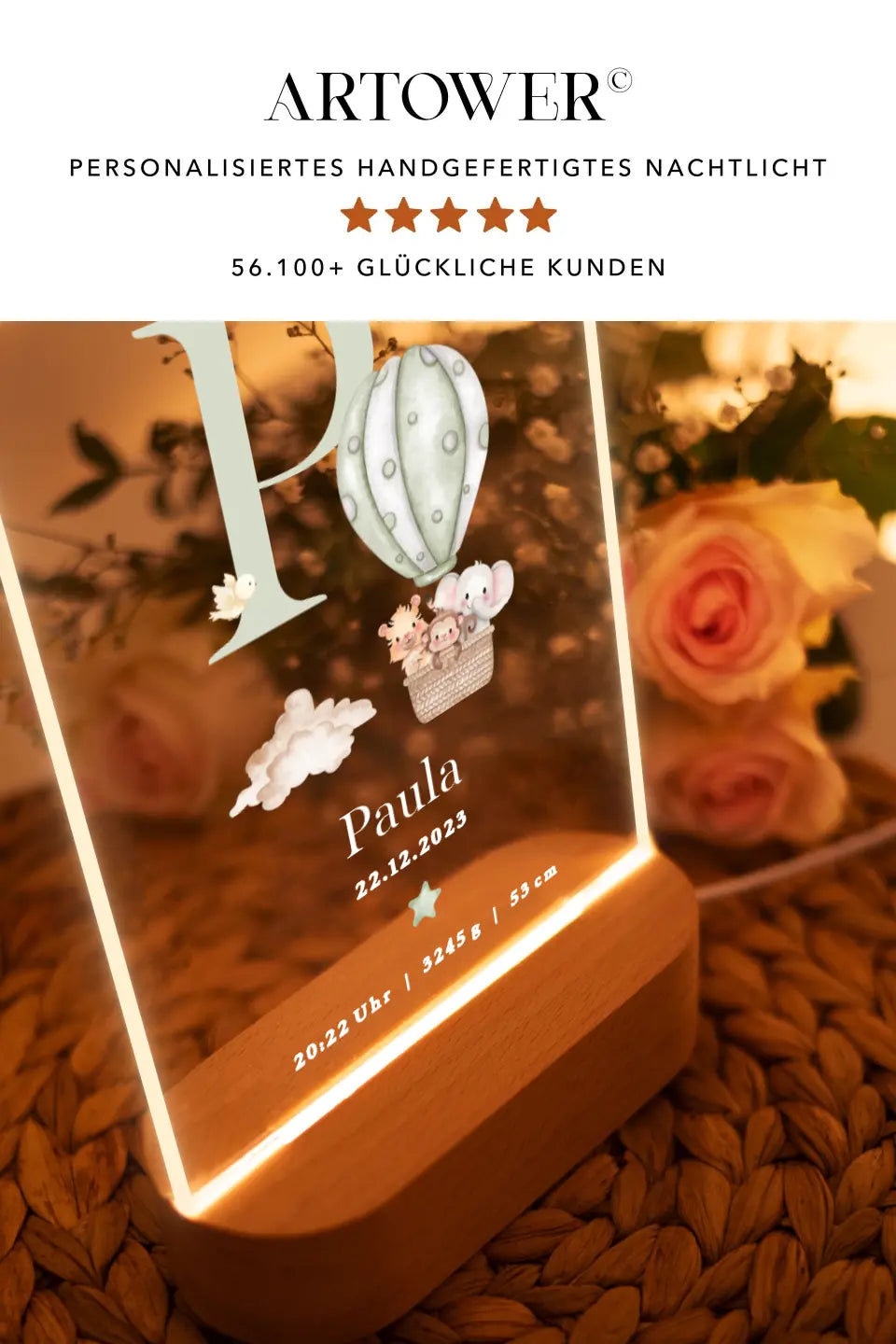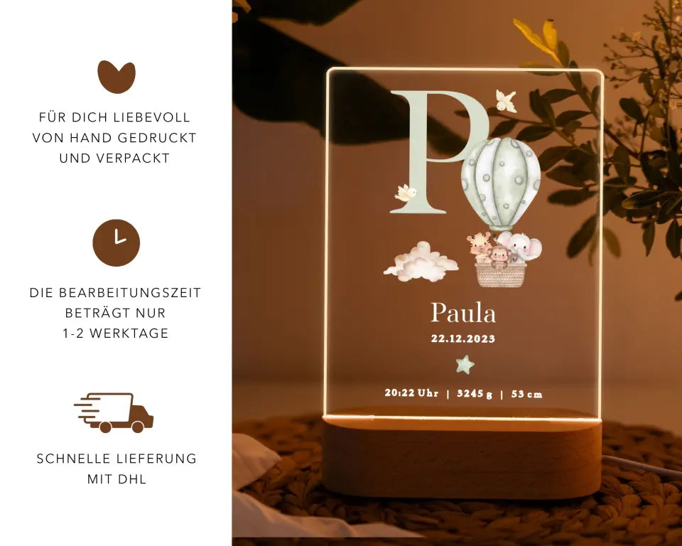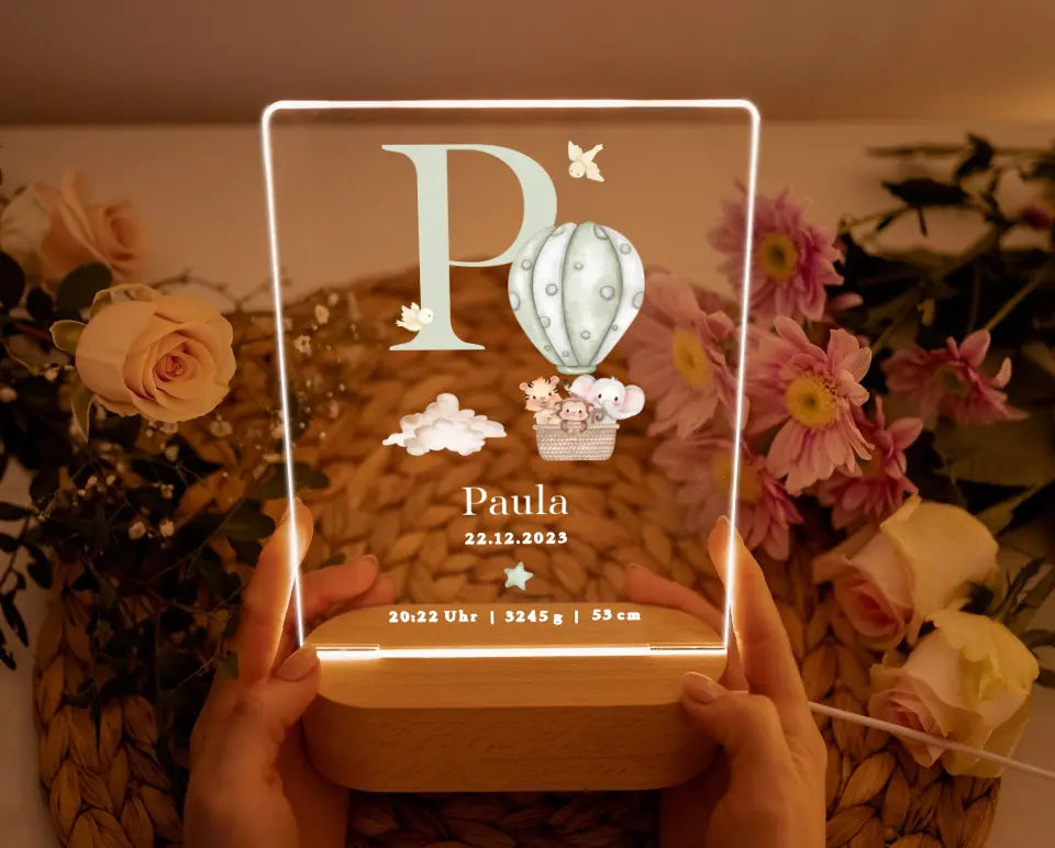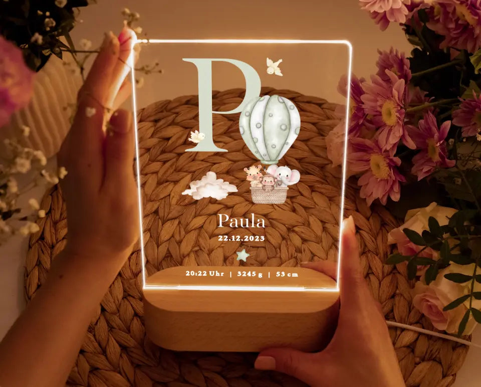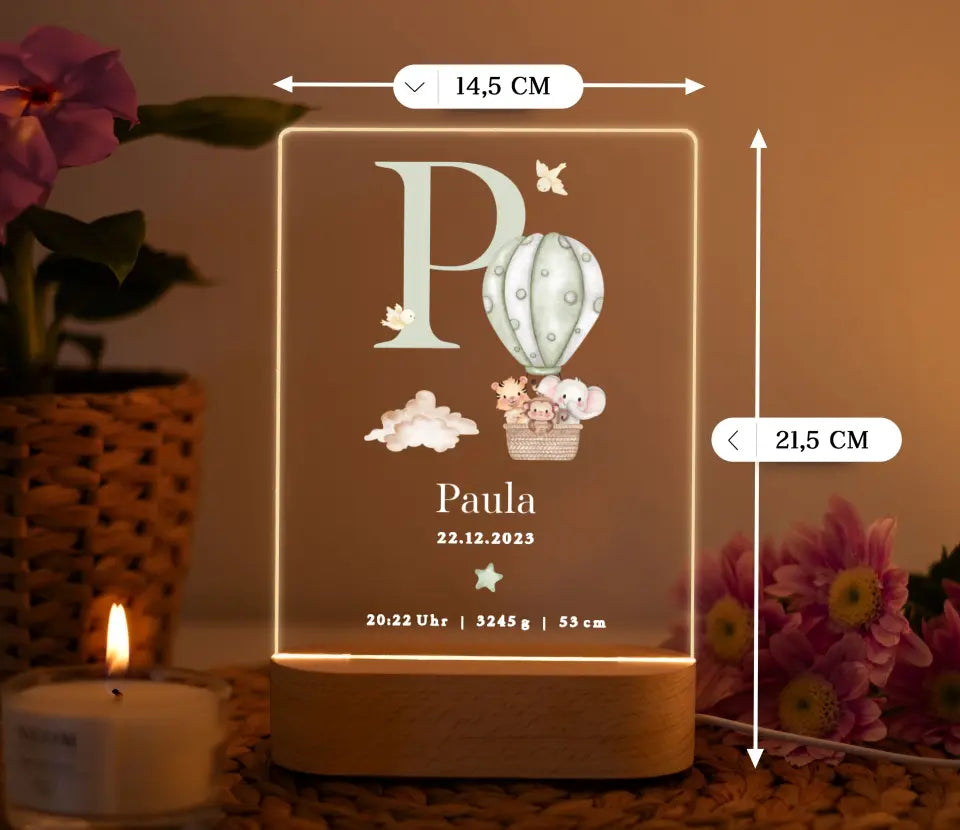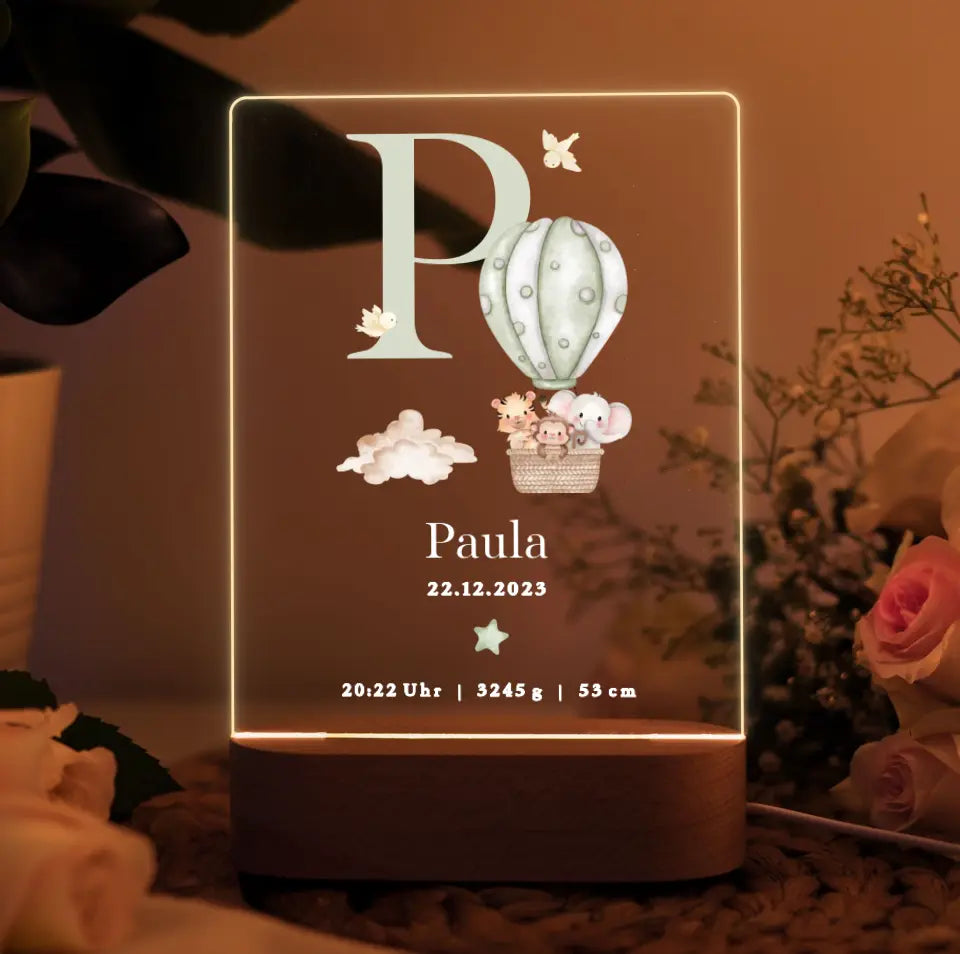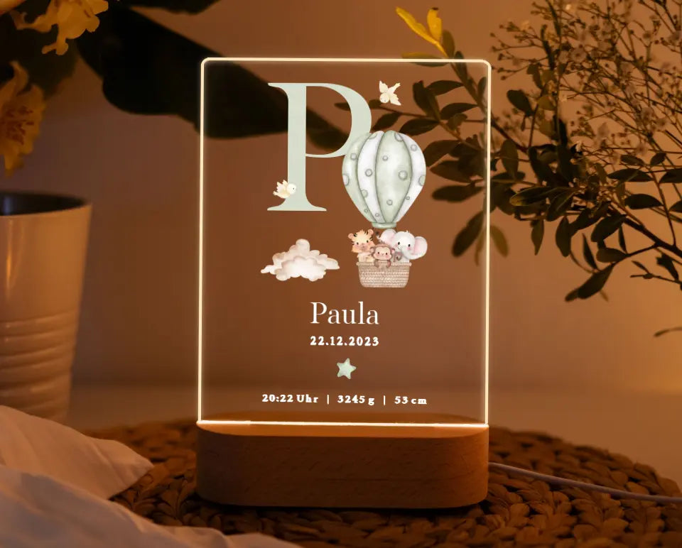 Nachtlicht personalisiertes Geburtsgeschenk Aquarell Tiere Heißluftballon Grün