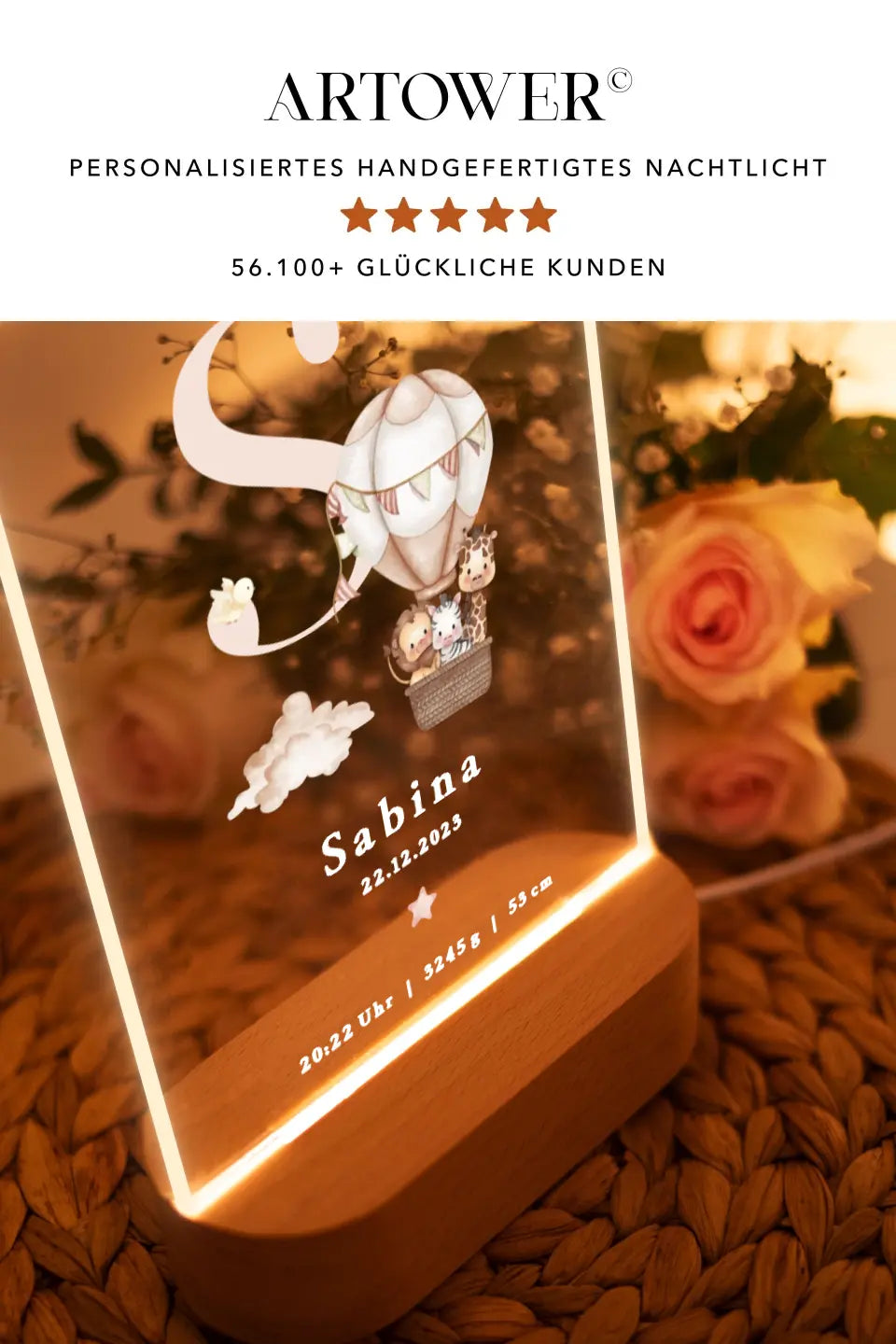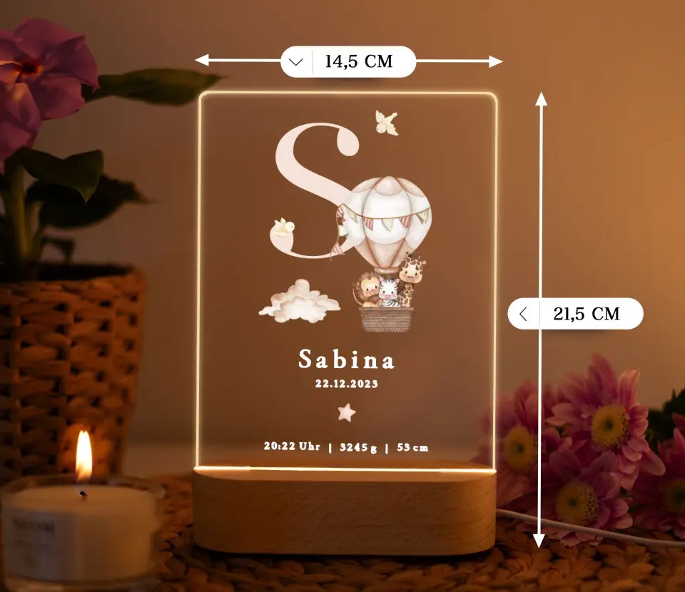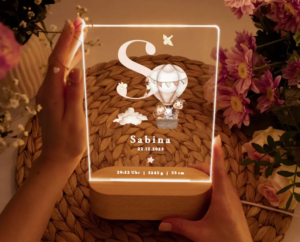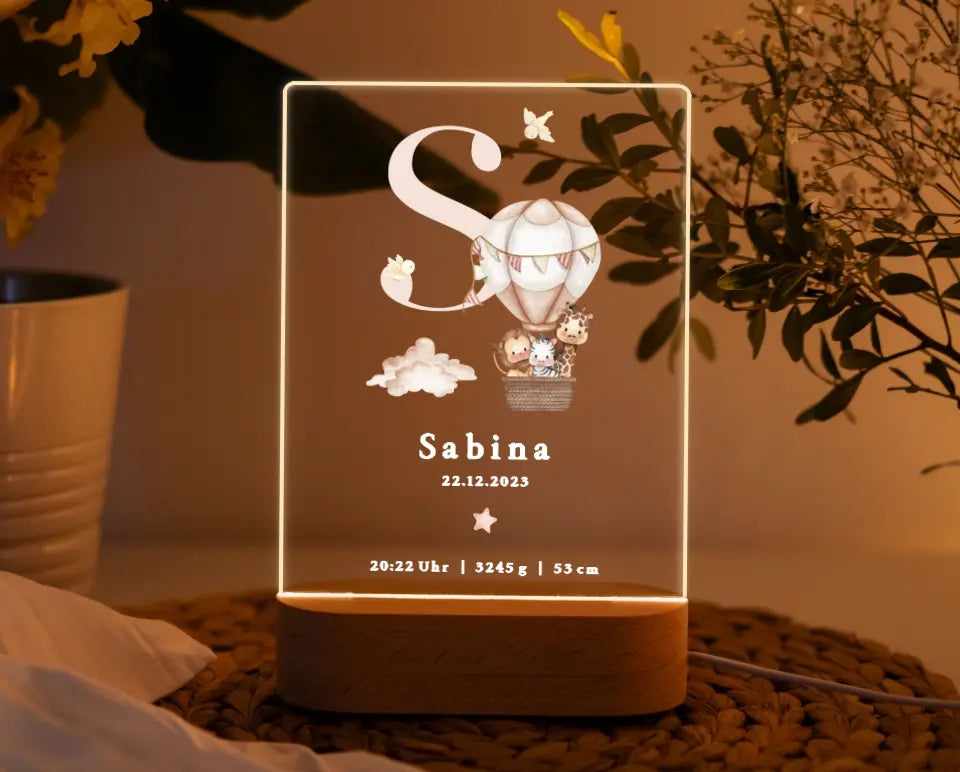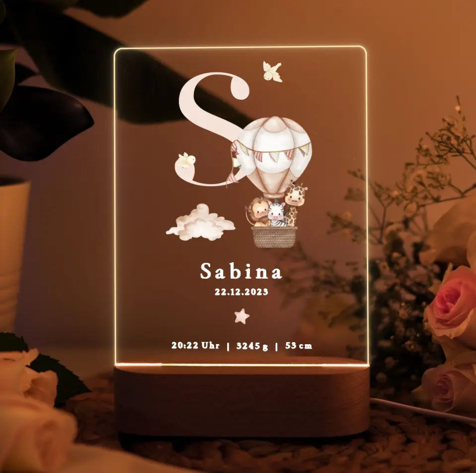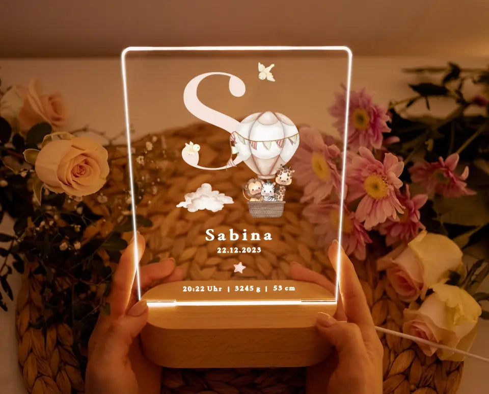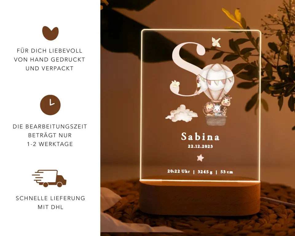 Nachtlicht personalisiertes Geburtsgeschenk Aquarell Tiere im Heißluftballon