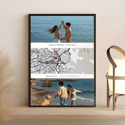 Personalisierter Stadtkarte-Poster mit Herz-Marker, zwei Fotos und exakten Koordinaten eures besonderen Ortes. Ein emotionales Kunstwerk, das eure Liebesgeschichte erzählt. Perfekt zum Hochzeitstag oder Jahrestag ❤️