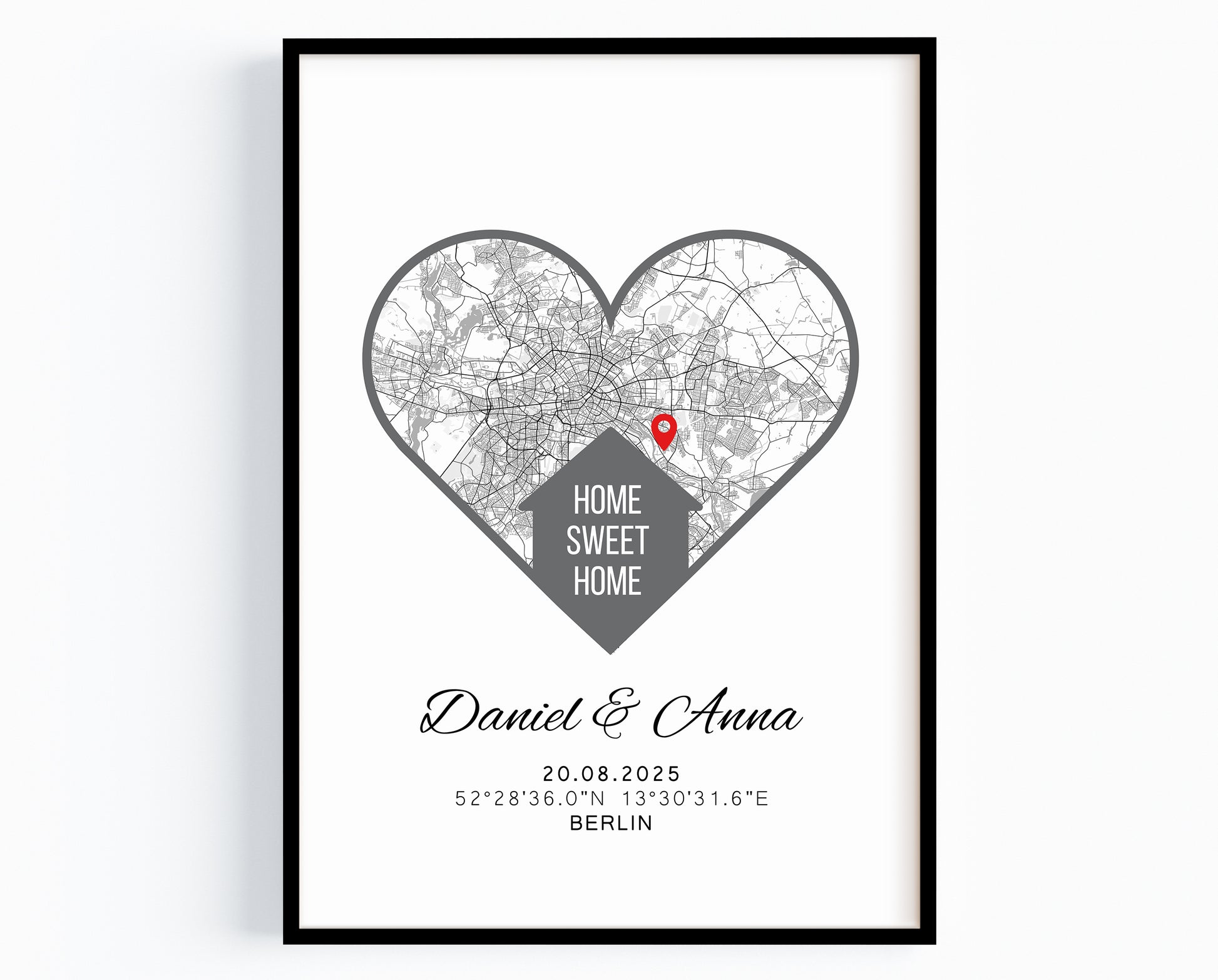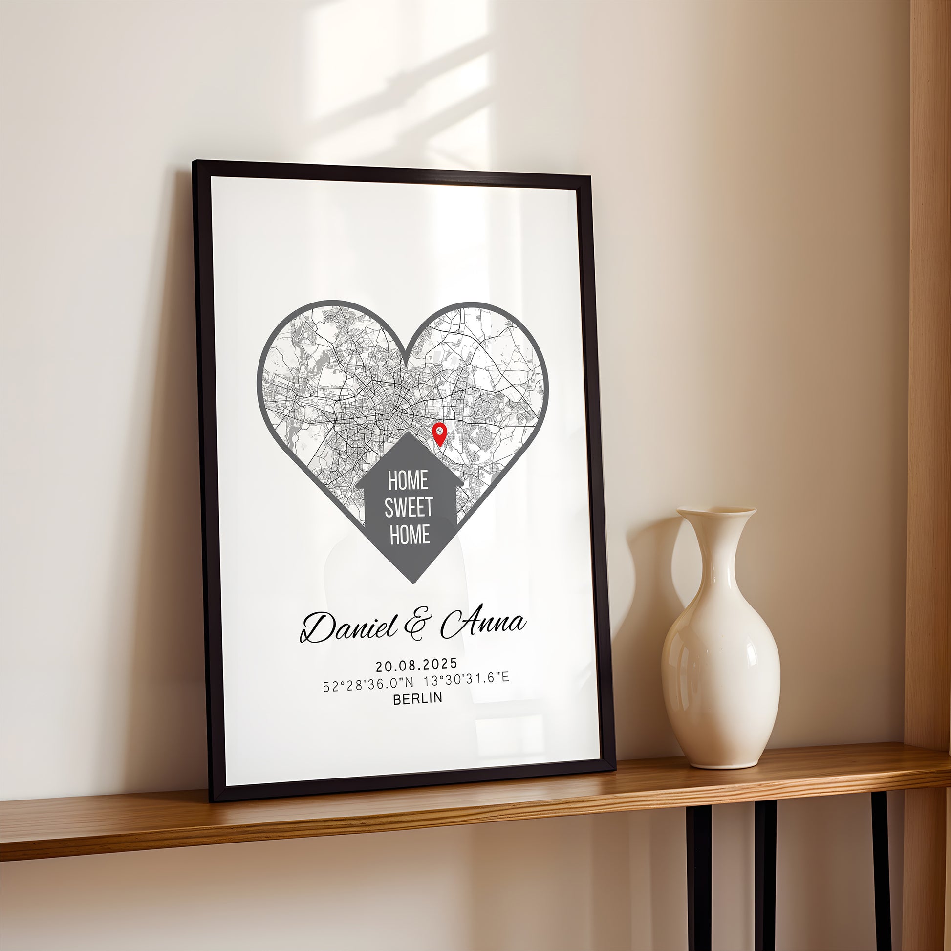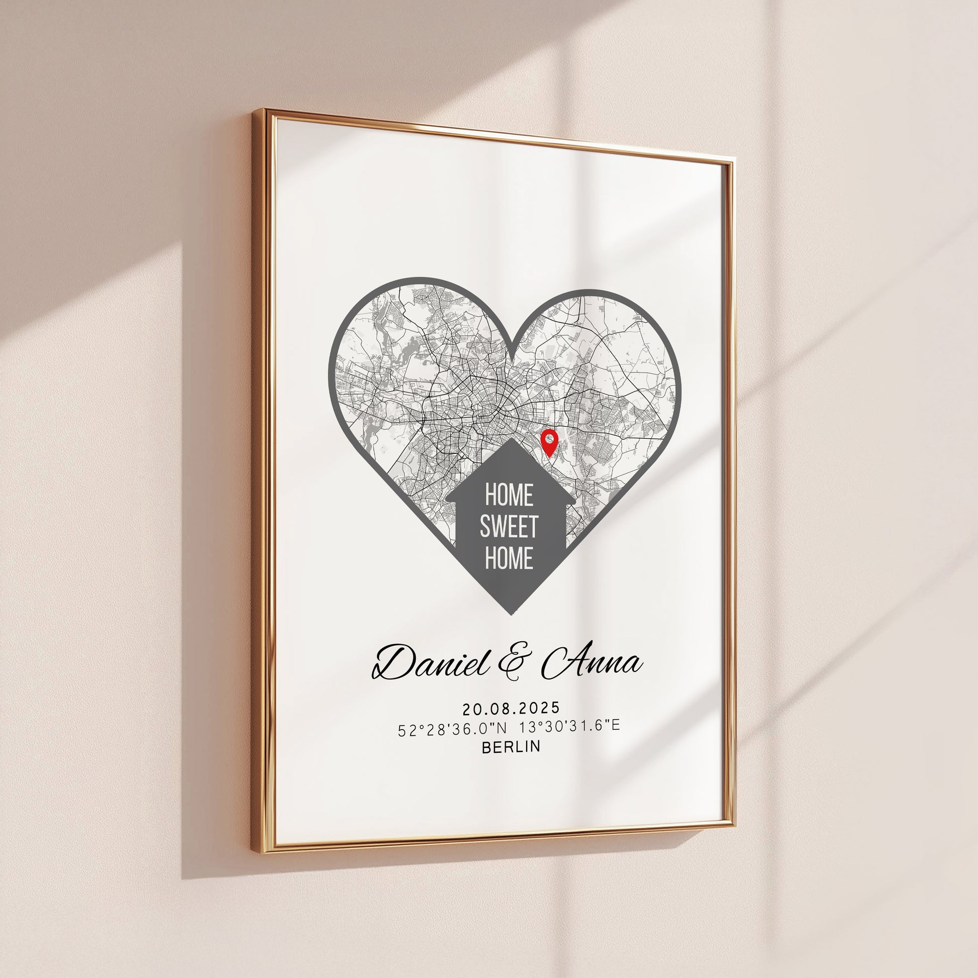 Personalisierte Stadtkarte mit Wunschort und „Home sweet home“-Schriftzug – das perfekte Einzugsgeschenk oder Erinnerungsstück für das neue Zuhause✨