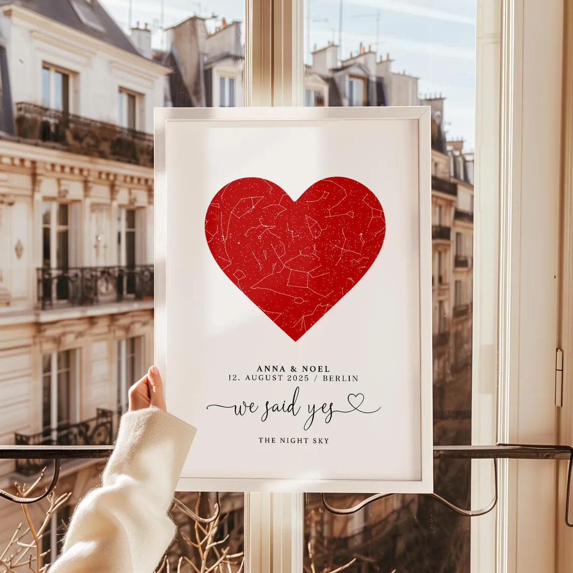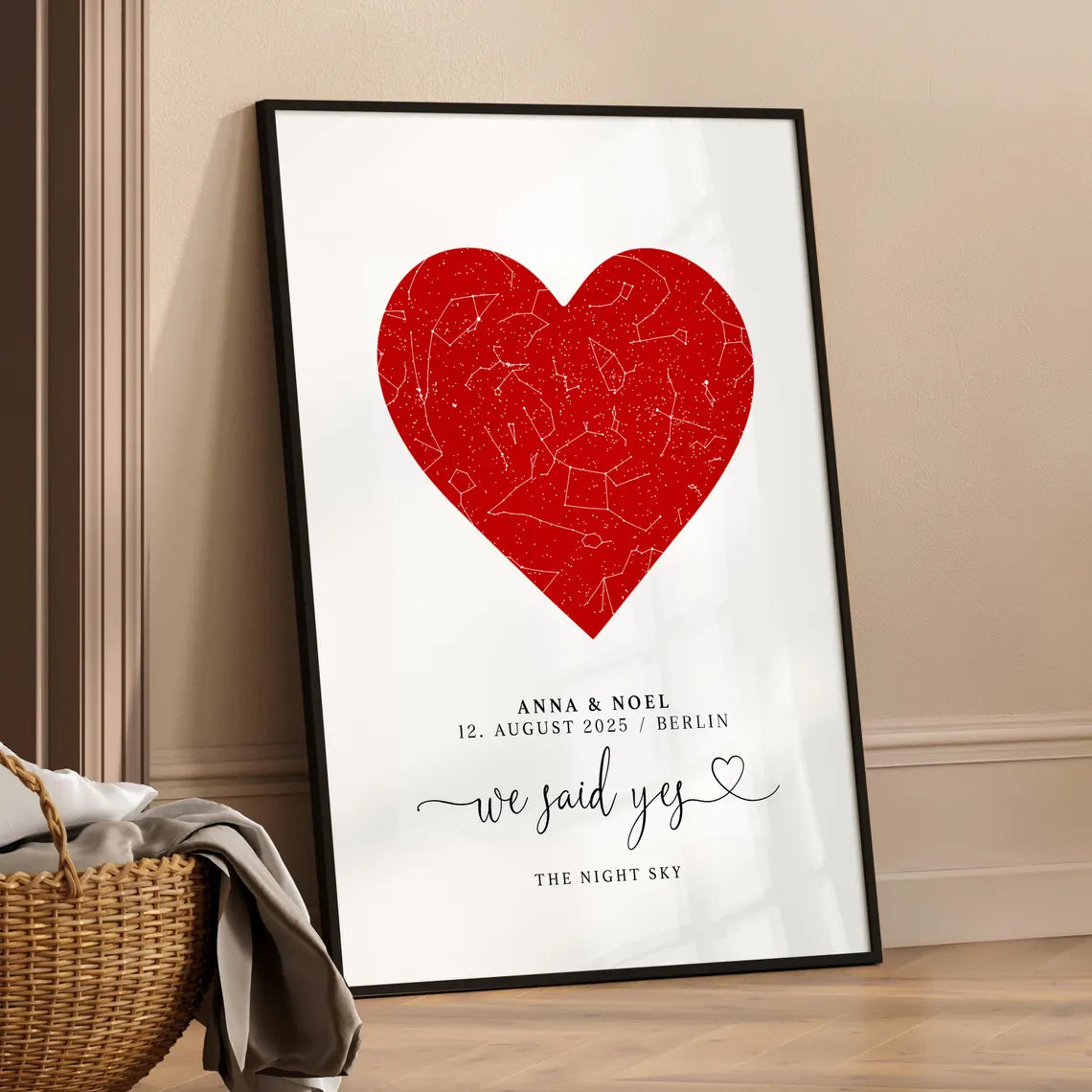 Dieses personalisierte Poster mit rotem Herz und Sternenhimmel ist ein wunderschönes Geschenk zur Verlobung oder Hochzeit. Mit dem Satz „We said yes“, den Namen und dem besonderen Datum wird es zu einer liebevollen Erinnerung für das Brautpaar – emotional, persönlich und einfach besonders😊✨