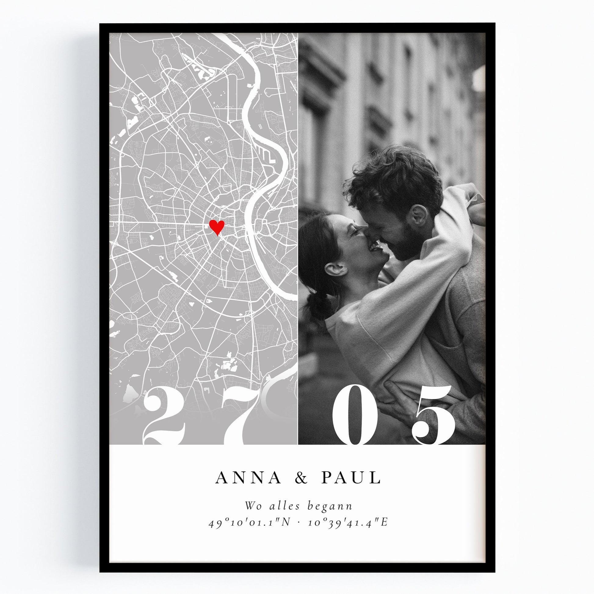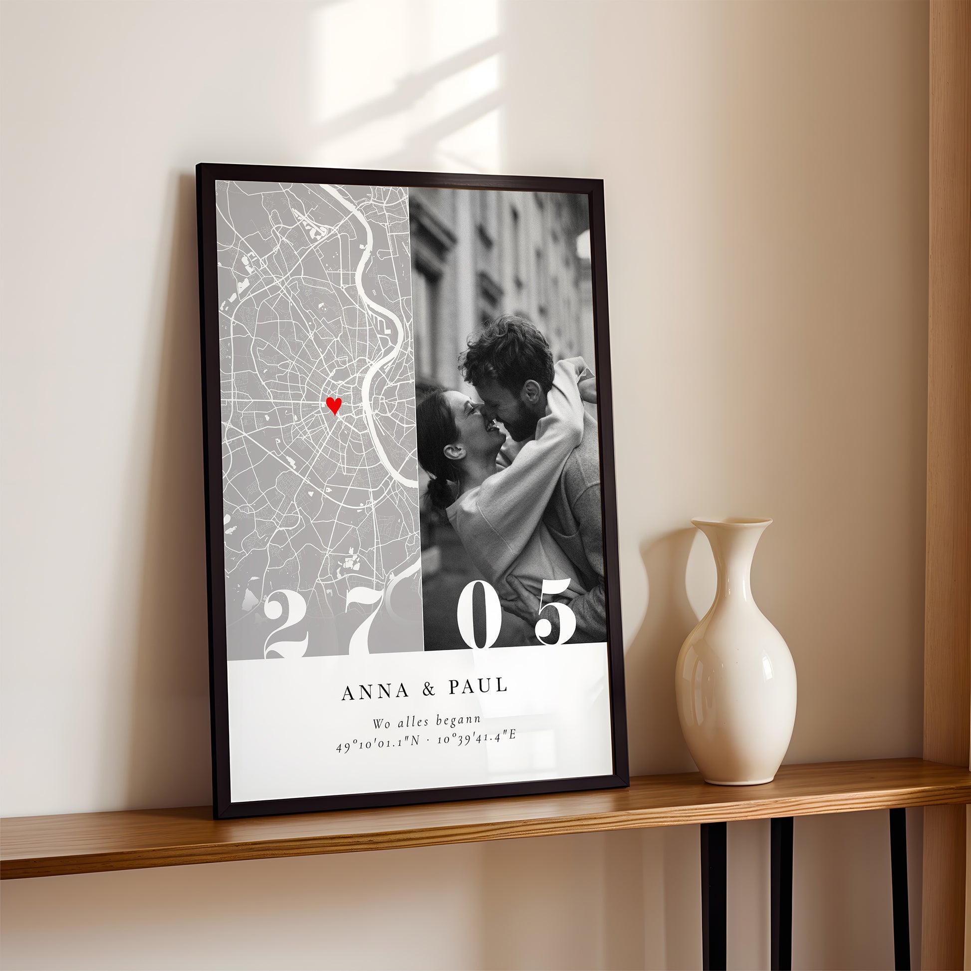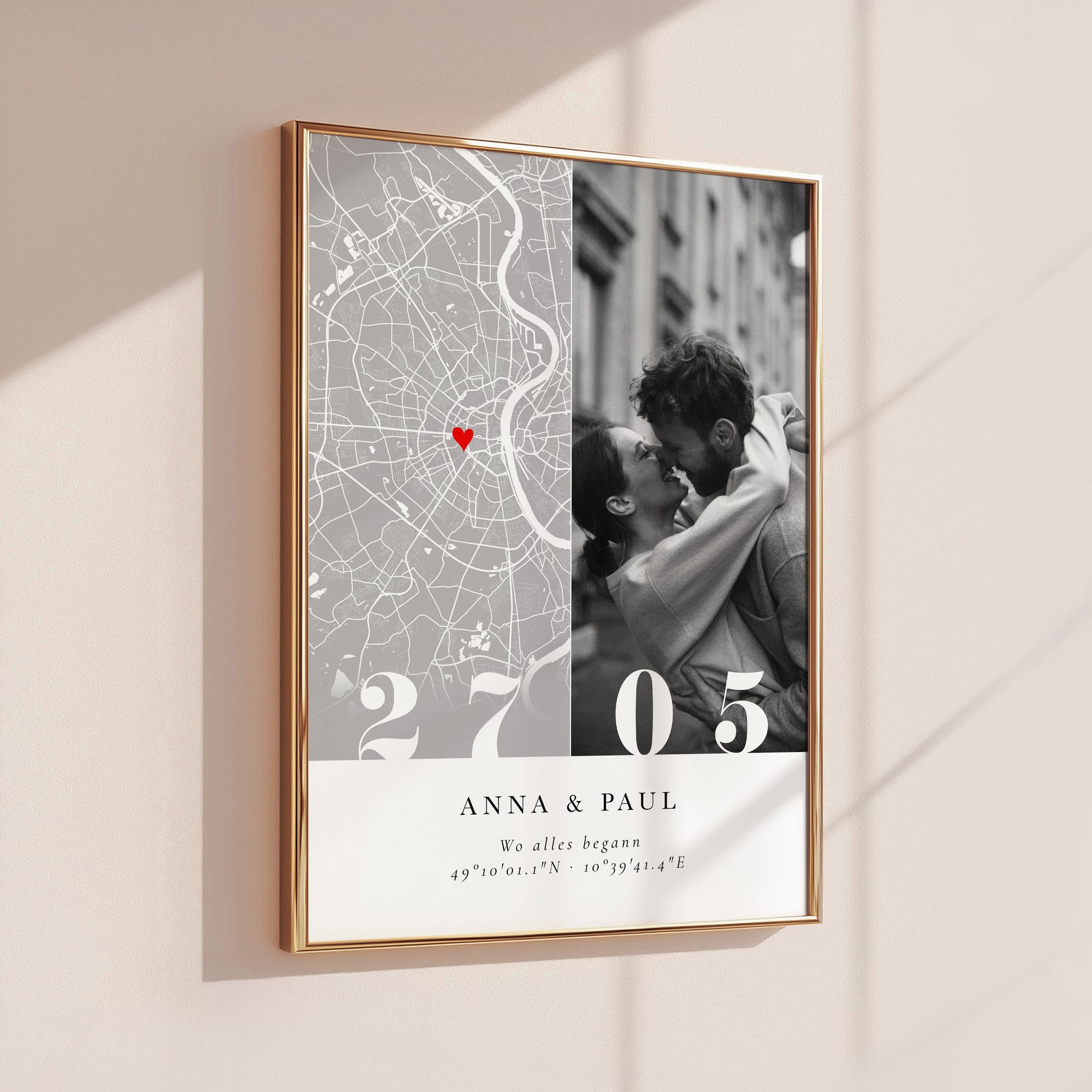 Romantischer Poster mit personalisierter Stadtkarte, Wunschfoto, Datum und dem Schriftzug „Wo alles begann“. Eine stilvolle Erinnerung – perfekt zur Verlobung oder zum Jahrestag 💕