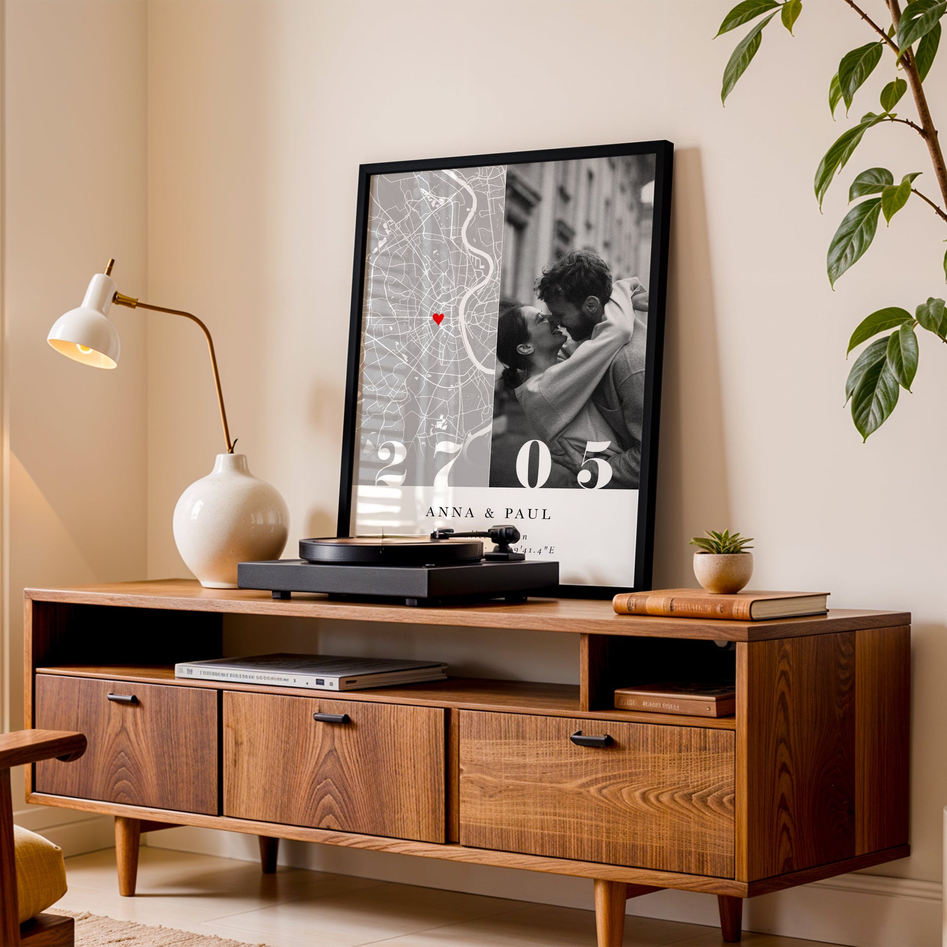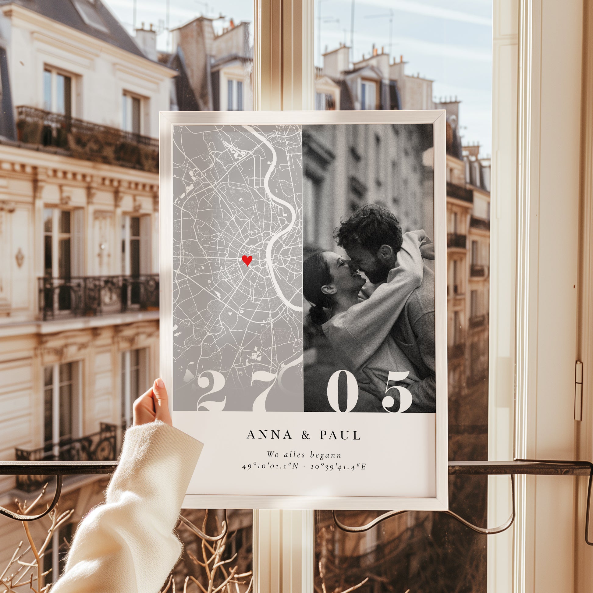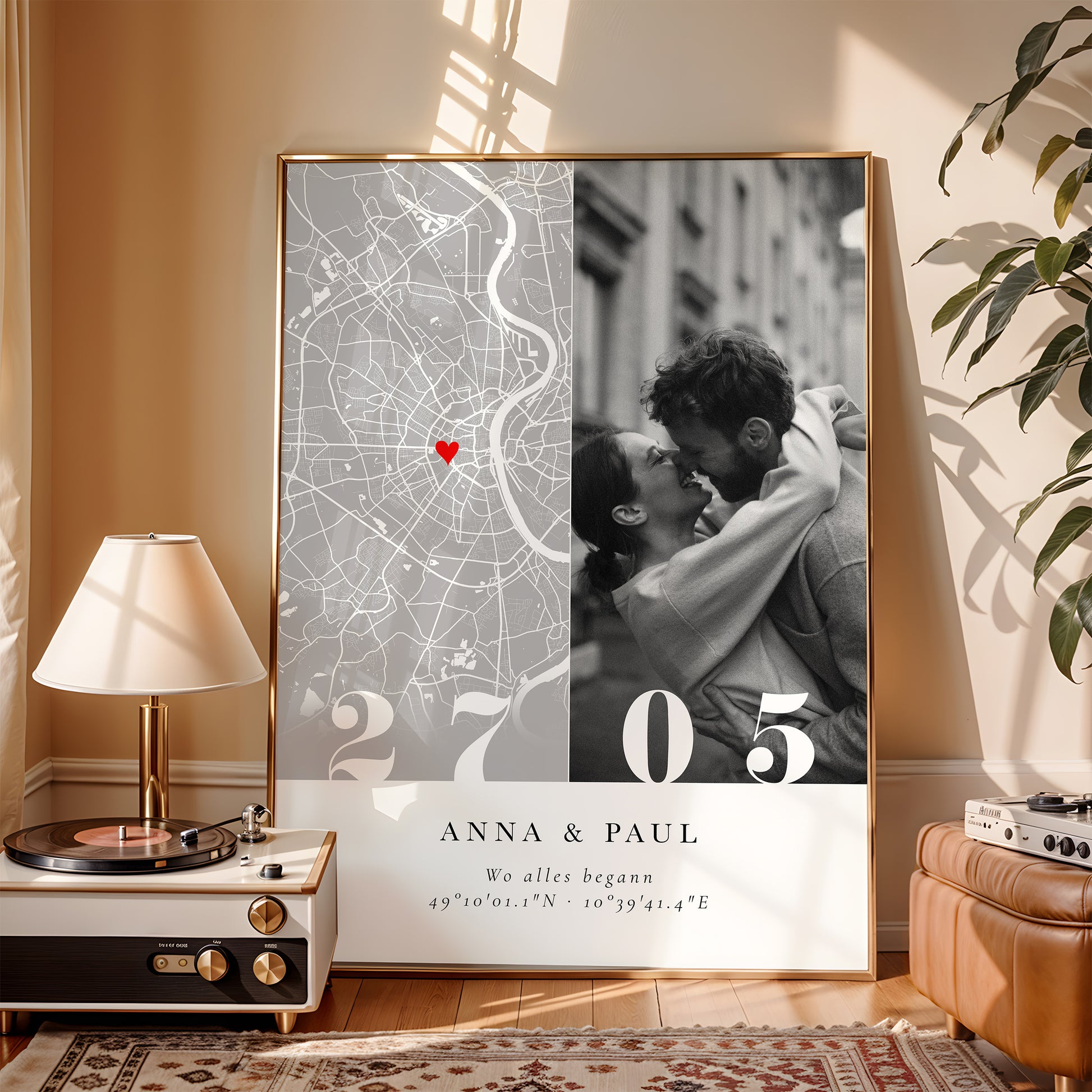 Romantischer Poster mit personalisierter Stadtkarte, Wunschfoto, Datum und dem Schriftzug „Wo alles begann“. Eine stilvolle Erinnerung – perfekt zur Verlobung oder zum Jahrestag 💕
