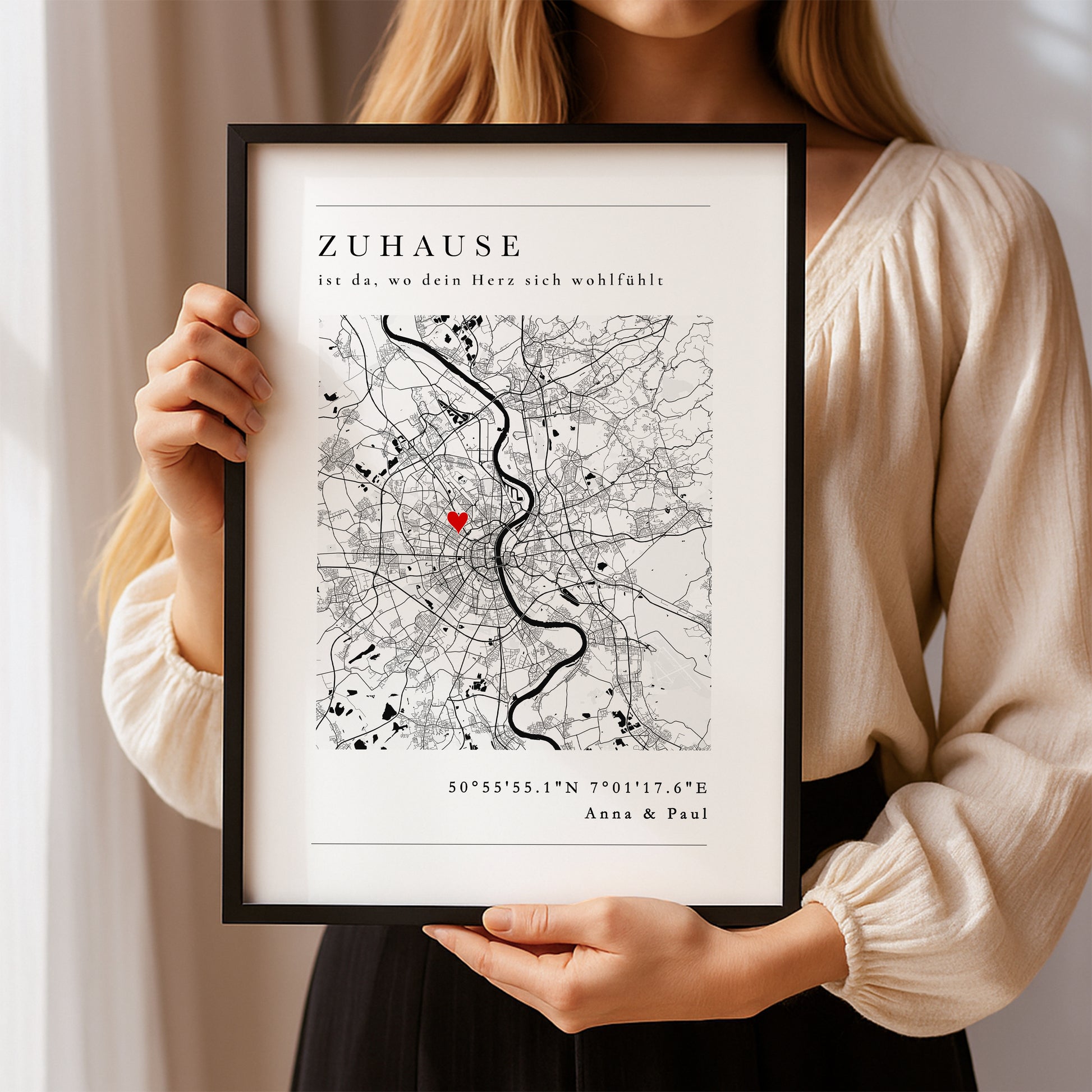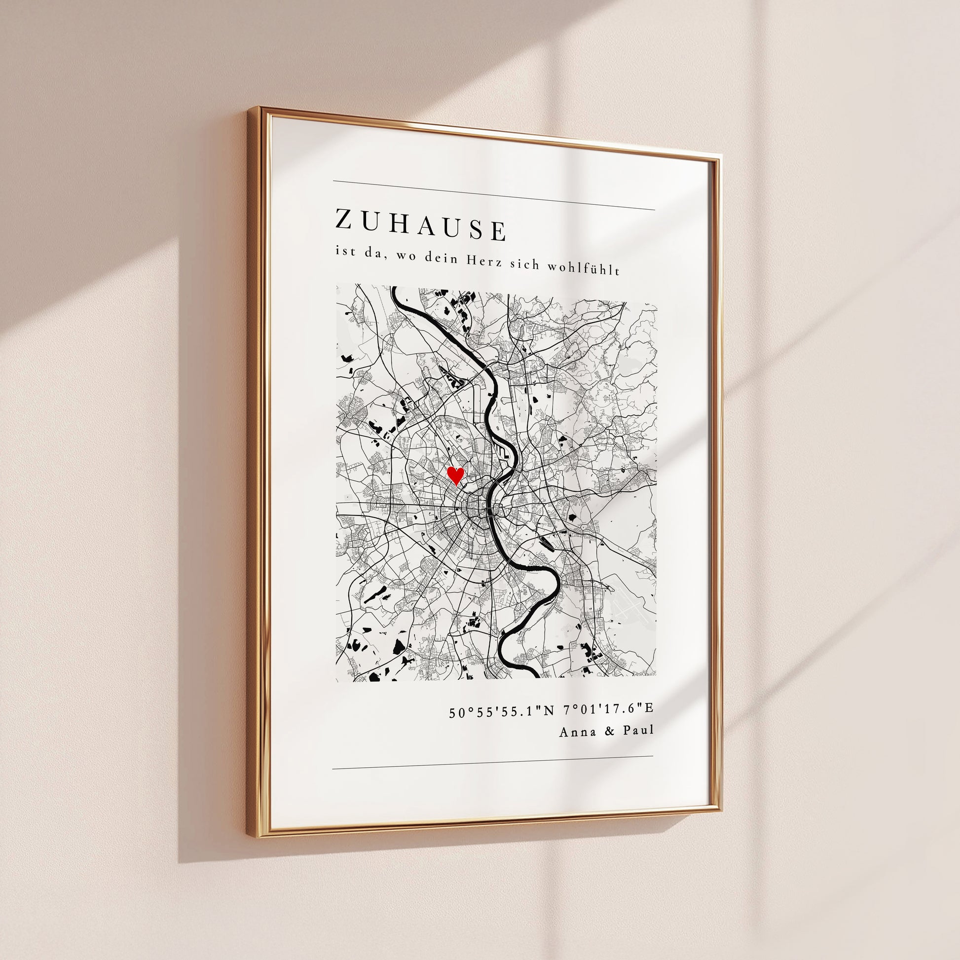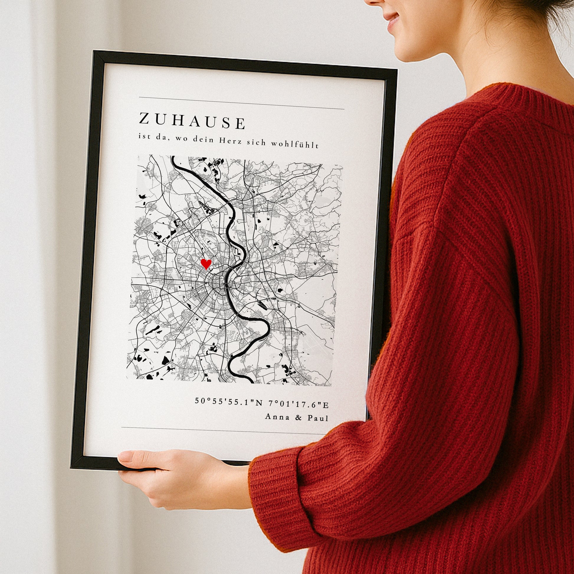 Ein individuell gestaltetes Poster mit Stadtkarte und Koordinaten – ideal als Geschenk zum Einzug, Geburtstag oder Richtfest. Eine stilvolle Erinnerung an den Ort, der Heimat bedeutet 🏡