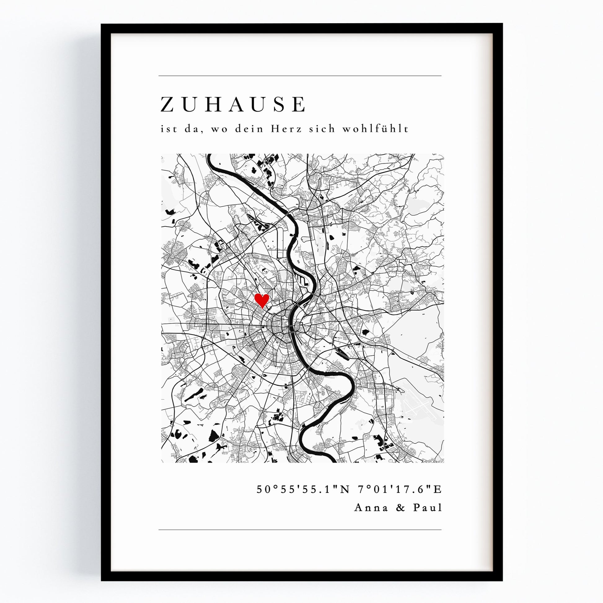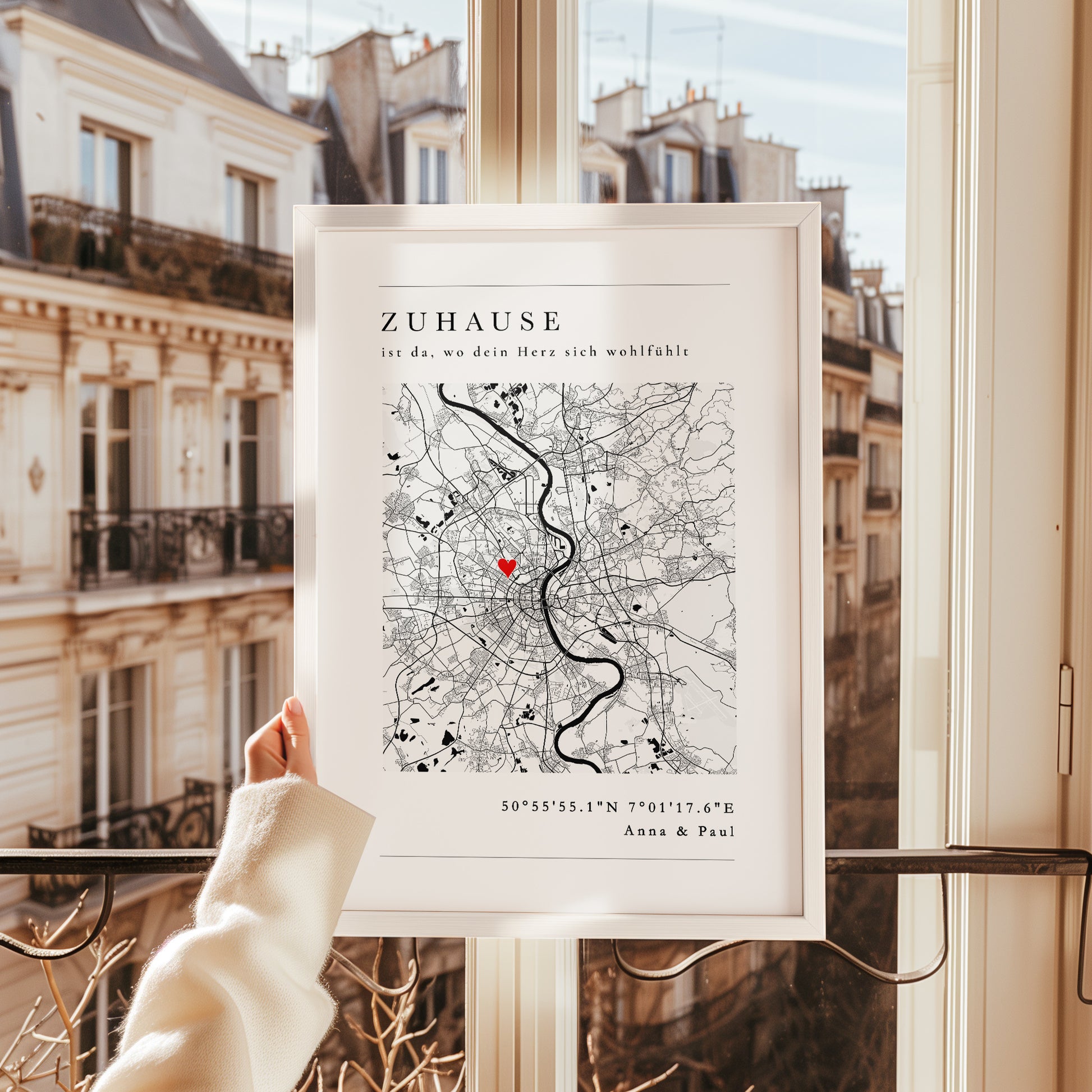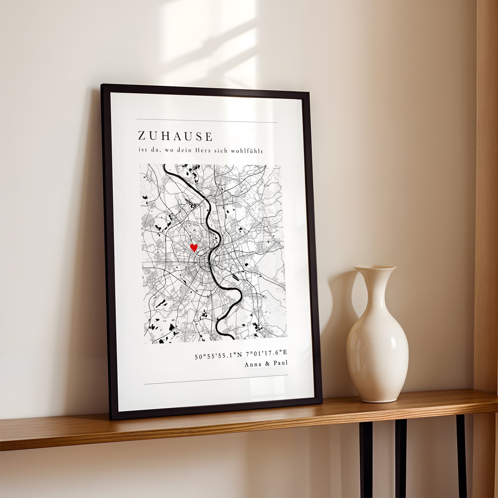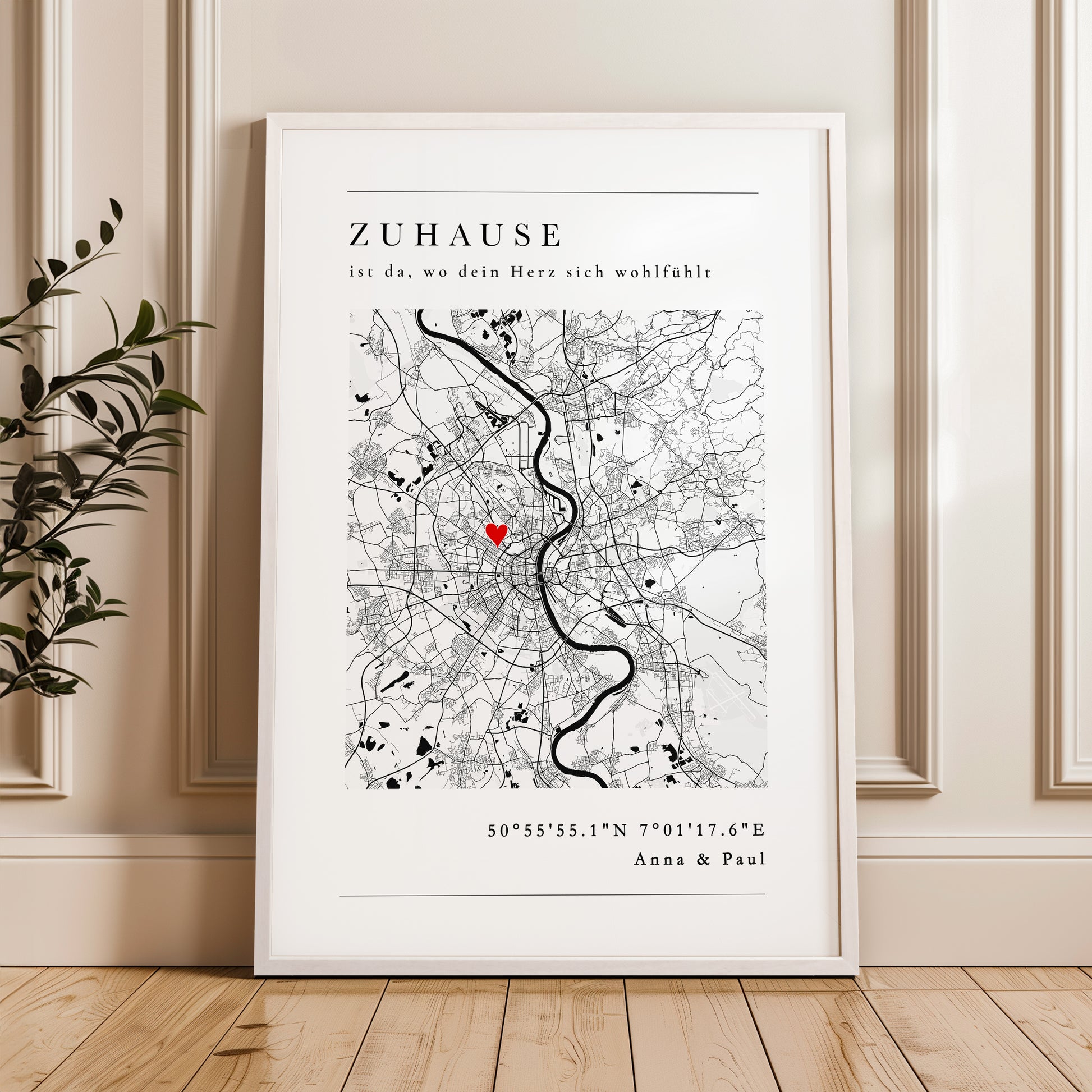 Ein individuell gestaltetes Poster mit Stadtkarte und Koordinaten – ideal als Geschenk zum Einzug, Geburtstag oder Richtfest. Eine stilvolle Erinnerung an den Ort, der Heimat bedeutet 🏡