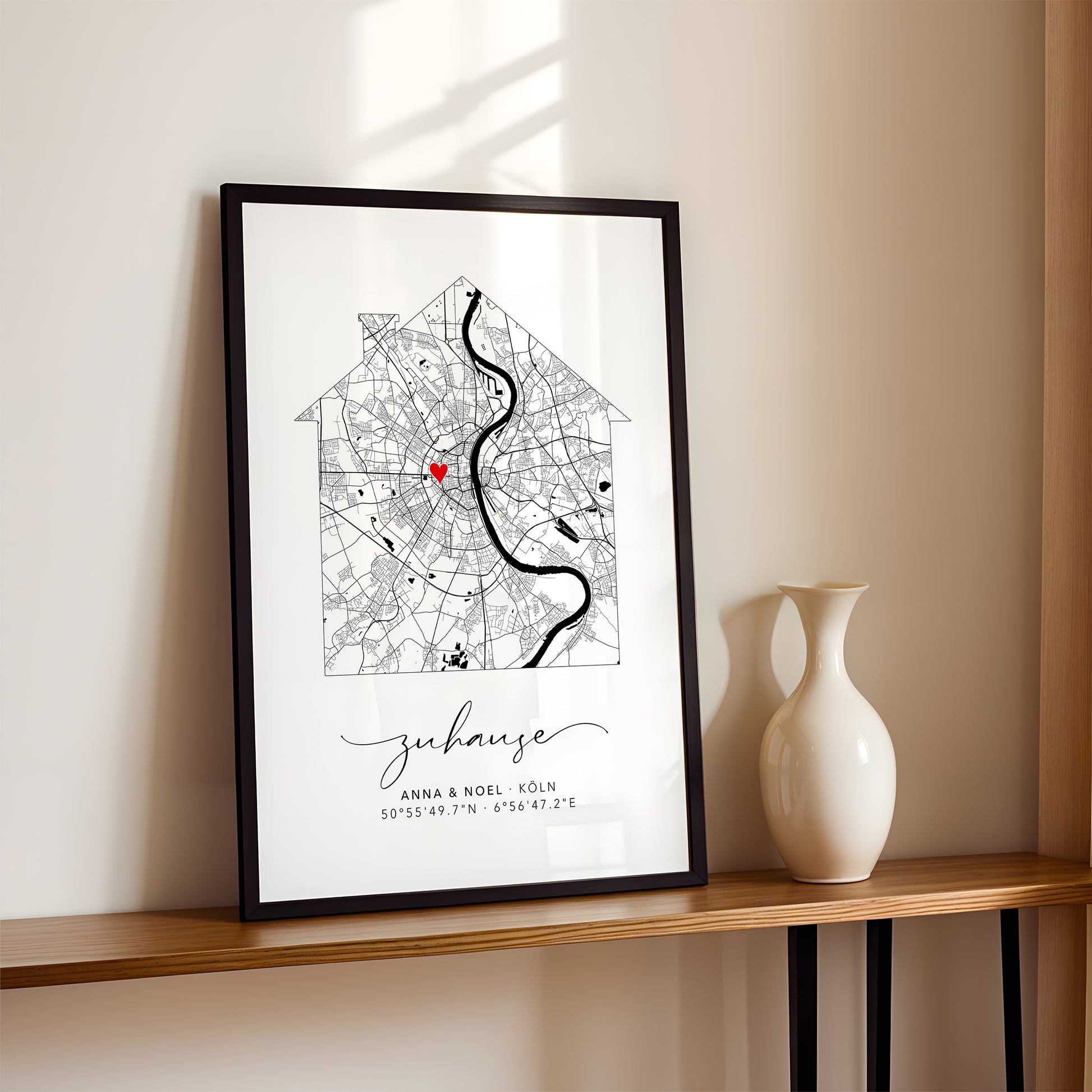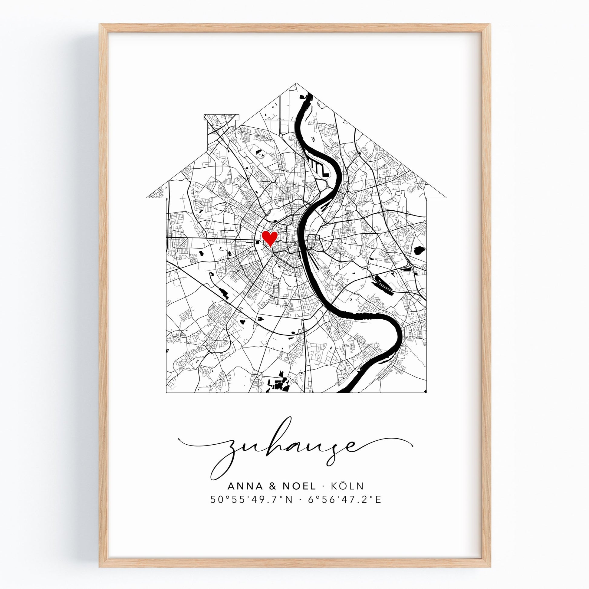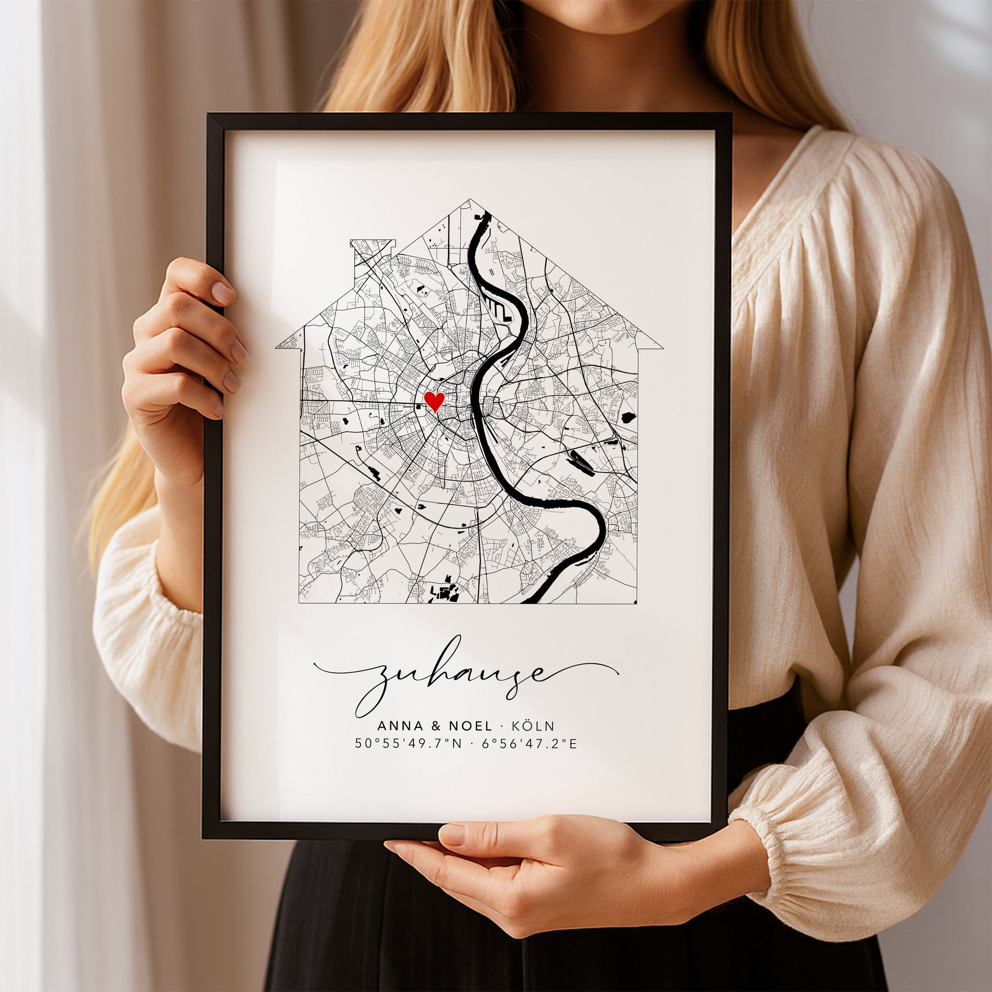 Personalisierte Stadtkarte mit Herz-Pin und dem Titel „Zuhause“ – ein besonderes Geschenk mit Bedeutung. Perfekt zum Einzug, Hausbau oder als liebevolle Erinnerung an den Lieblingsort 🏡